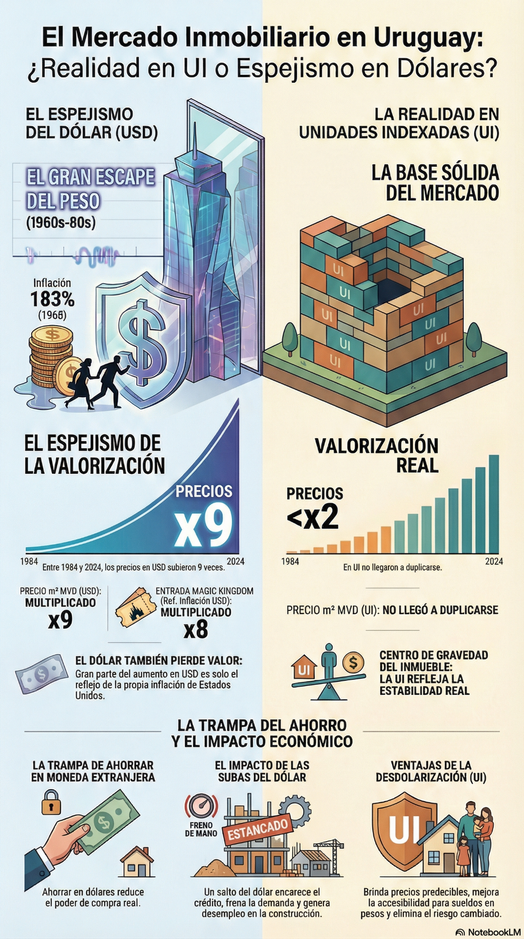 Para entender por qué estamos en esta situación, hay que mirar hacia atrás. La dolarización del mercado inmobiliario es la cicatriz de una era de alta inflación y represión financiera. En 1968, por ejemplo, la inflación llegó al 183% mientras los bancos pagaban intereses bajísimos (6%); esto hacía que los ahorristas perdieran casi el 40% de su dinero real en un solo año. Ante este escenario, los uruguayos buscaron "escudos" para proteger su capital, encontrando en el dólar y en los inmuebles sus refugios predilectos.