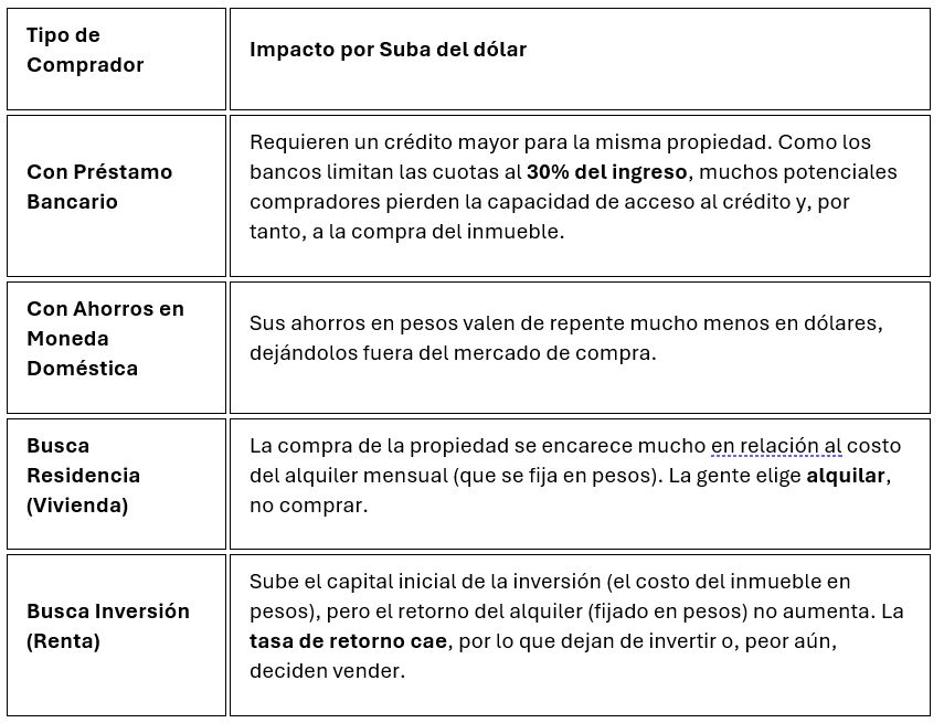 Una suba del dólar actúa como un doble castigo para el mercado, impactando a los compradores desde sus fuentes de financiación y sus objetivos de inversión: