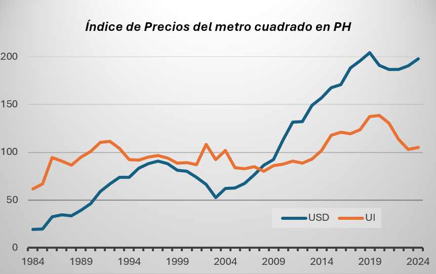 Para verificar esto, en el gráfico a continuación se observa la evolución de precios del metro cuadrado en propiedad horizontal en Montevideo entre 1984 y 2024, medido tanto en dólares americanos como en Unidades Indexadas.